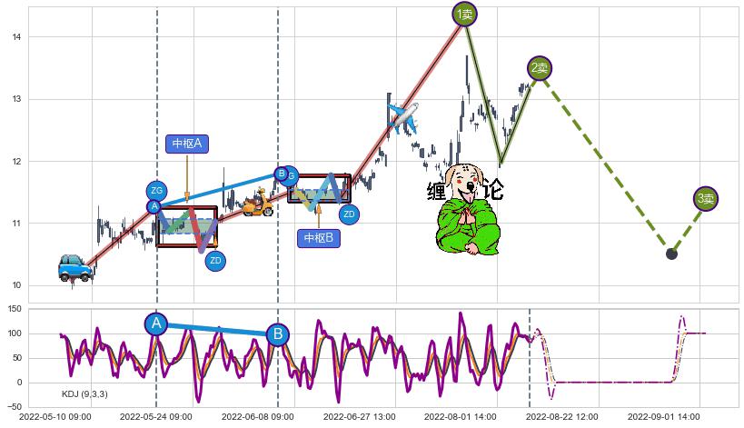 从2022-08-02 14:00至2022-08-12 14:00,共包含15个小时,阶段股价上涨9.47%,阶段股价变动位移路程比: 1 : 1.4