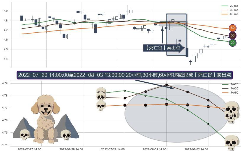 ⚀ 2022-08-01 13:00:00-小时至2022-08-03 13:00:00-小时显现 20小时-30小时-60小时均线 【死亡谷】卖出点 看空信号,后市看跌,卖出