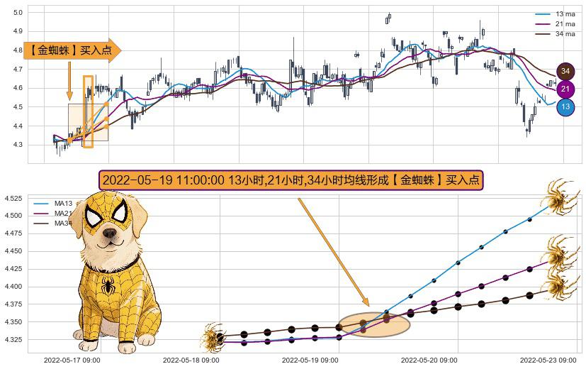 ⚀ 2022-05-19 11:00:00小时显现 13小时-21小时-34小时均线 【金蜘蛛】买入点 看多信号,后市看涨,买入