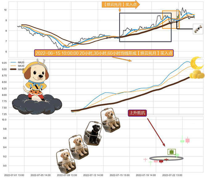 ➢ 【烘云托月】买入点:猜想持续上涨 → 多头排列 → 中短均线纠缠粘合 → 长均线托举中短均线 → 中继信号 → 烘云托月买入点
