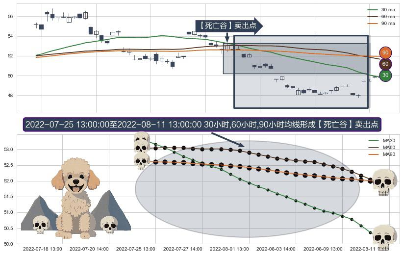 ⚀ 2022-07-25 14:00:00-小时至2022-08-11 13:00:00-小时显现 30小时-60小时-90小时均线 【死亡谷】卖出点 看空信号,后市看跌,卖出