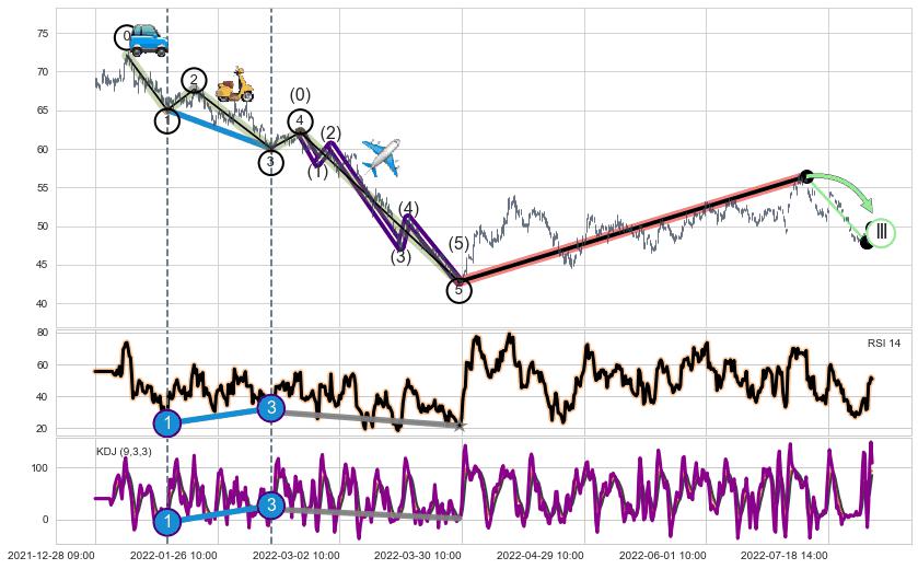 ➣ 第一, 三驱动浪端点:【KDJ】走势出现【常规背离 & 反转信号】背离程度63.73%,背离夹角角度86.8˚,背离程度较大