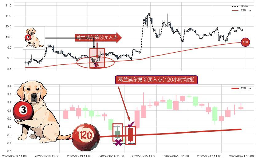 ⚀ 2022-06-14 13:00:00-小时显现 葛兰威尔均线 120小时均线 第③买入点 上升趋势的中继信号,后市看涨,买进信号