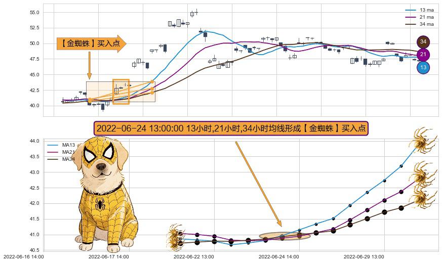 形态多维评估: ⚀ 2022-06-24 13:00:00小时显现 13小时-21小时-34小时均线 【金蜘蛛】买入点 看多信号,后市看涨,买入