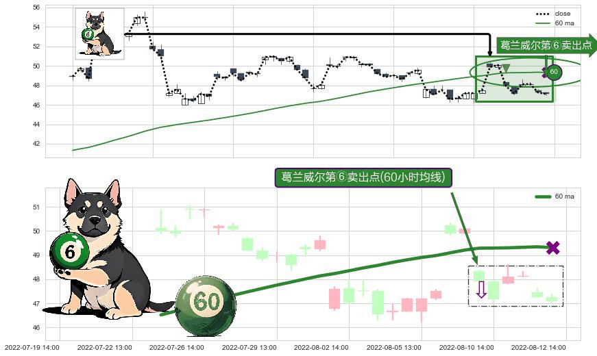 形态多维评估: ⚀ 2022-08-10 13:00:00-小时显现 葛兰威尔均线 60小时均线 第⑥卖出点 走势反转见顶信号,后市看跌,卖出信号