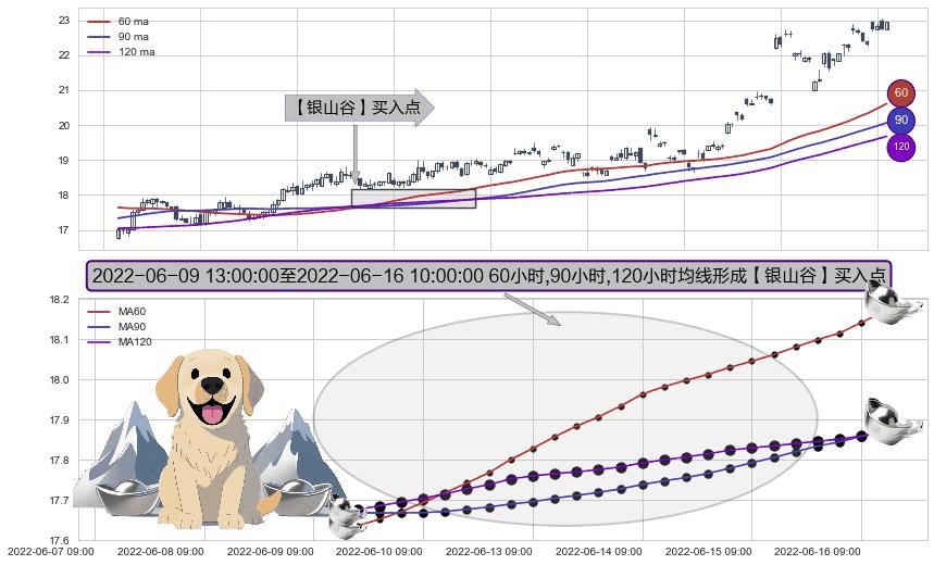 形态多维评估: ⚀ 2022-06-09 14:00:00-小时至2022-06-16 10:00:00-小时显现 60小时-90小时-120小时均线 【银山谷】买入点 看多信号,后市看涨,买入