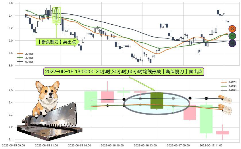 ⚀ 2022-06-16 13:00:00小时显现 20小时-30小时-60小时均线 【断头铡刀】卖出点 看空信号,后市看跌,卖出