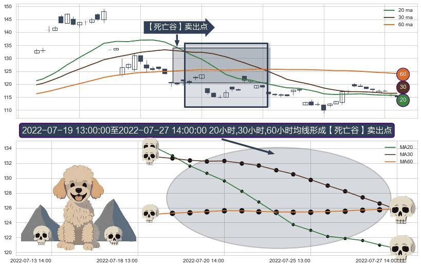 ⚀ 2022-07-19 14:00:00-小时至2022-07-27 14:00:00-小时显现 20小时-30小时-60小时均线 【死亡谷】卖出点 看空信号,后市看跌,卖出