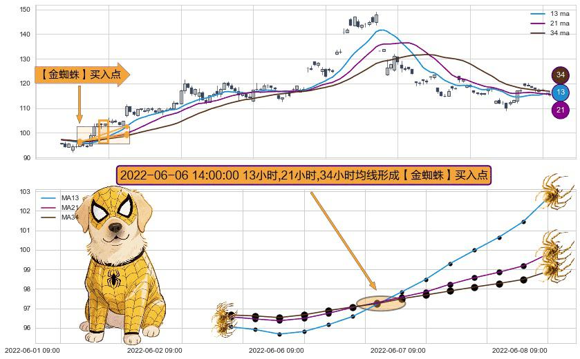 ⚀ 2022-06-06 14:00:00小时显现 13小时-21小时-34小时均线 【金蜘蛛】买入点 看多信号,后市看涨,买入