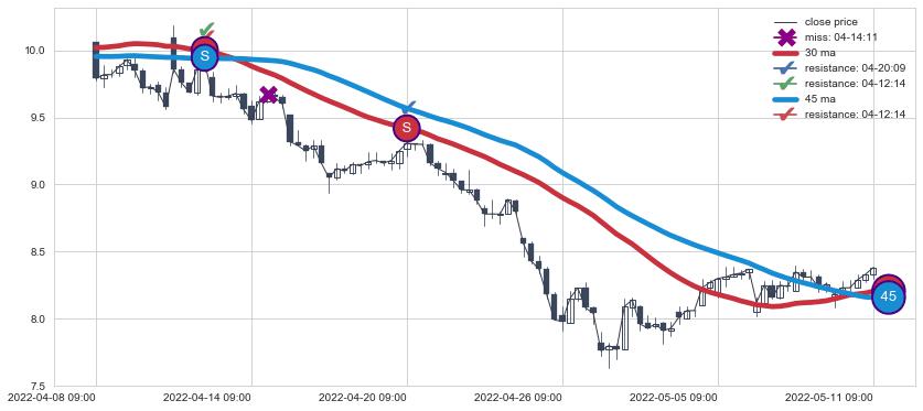 ⚅ 卖点向下突破均线后,价格走势有持续向下的迹象,但动能稍显不足,迟迟不能远离均线