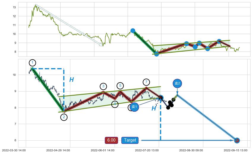 ➢ 最小中继整理跌幅→𝐇: 4.22 (低点逐步抬高斜边第一支撑点②与阻力边垂直距离)