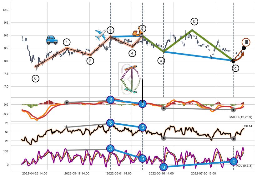 ➢ 1,3,5驱动浪MACD, RSI, KDJ走势都出现【常规背离】反转信号增强