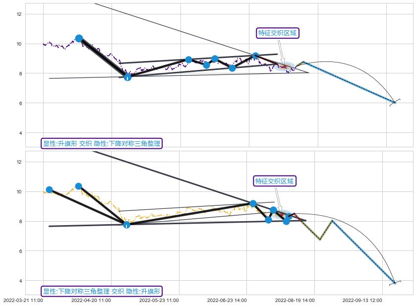 ➣ 【未确认突破,预测即将形成突破】下降【对称】三角形整理起点:03-23:10, 预测突破点:08-05:14,形态共354交易小时