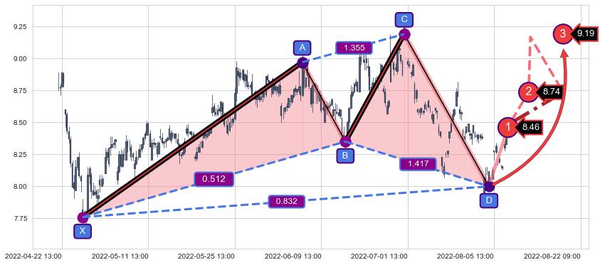 ➣ D点拟合预测价格8.94,距离最后交易收盘价格8.49相差 +5.32%