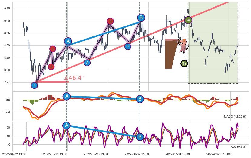 从2022-04-27 09:00至2022-06-14 10:00,共包含152个小时,阶段股价上涨8.12%,阶段股价变动位移路程比: 1 : 12,上涨趋势角度: 46.4