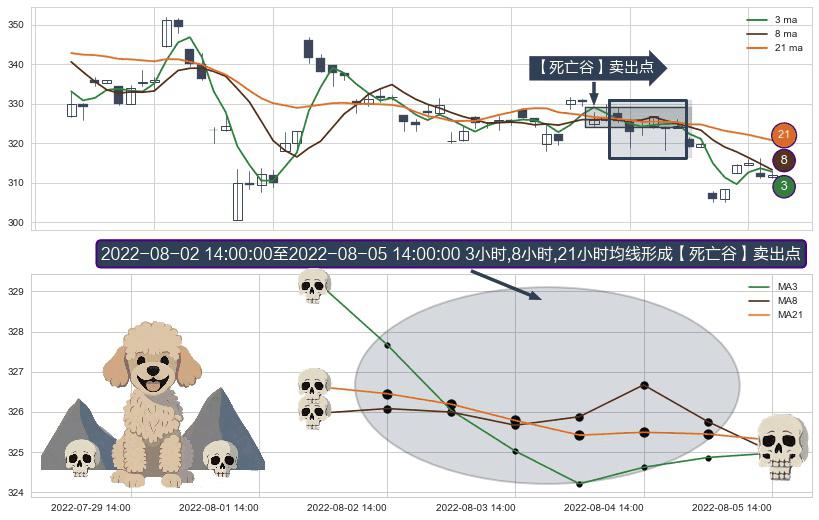 形态多维评估: ⚀ 2022-08-03 13:00:00-小时至2022-08-05 14:00:00-小时显现 3小时-8小时-21小时均线 【死亡谷】卖出点 看空信号,后市看跌,卖出