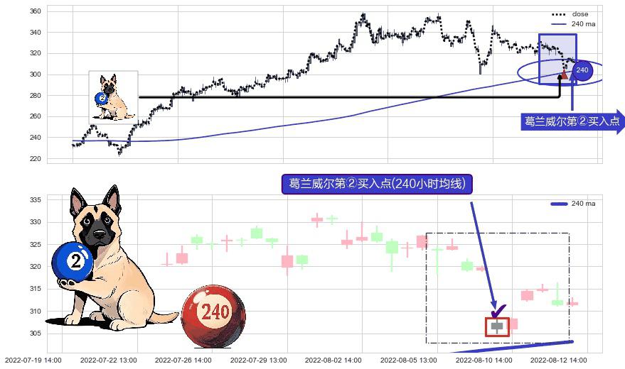 形态多维评估: ⚀ 2022-08-10 13:00:00-小时显现 葛兰威尔均线 240小时均线 第②买入点 上升趋势的中继信号,后市看涨,买进信号