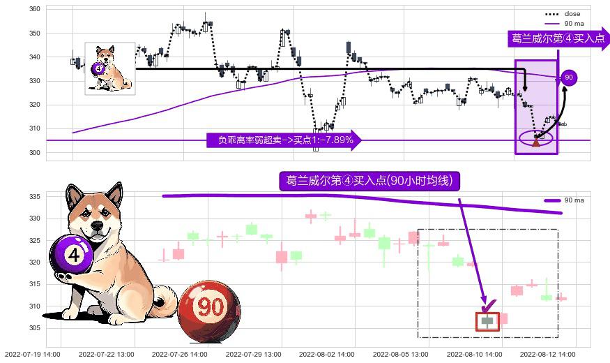 形态多维评估: ⚀ 2022-08-10 13:00:00-小时显现 葛兰威尔均线 90小时均线 第④买入点 下降趋势均值回复的短线反弹信号,后市看涨,买进信号