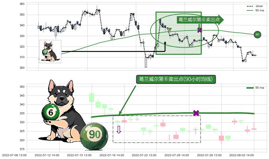 形态多维评估: ⚀ 2022-07-19 13:00:00-小时显现 葛兰威尔均线 90小时均线 第⑥卖出点 走势反转见顶信号,后市看跌,卖出信号