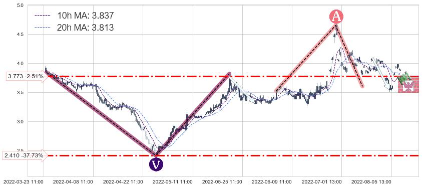♘ 支撑价格位3.773,可信任强度65.56%,距离最后交易2022-08-12 14:00形成的收盘价格3.870相差 -2.51%
