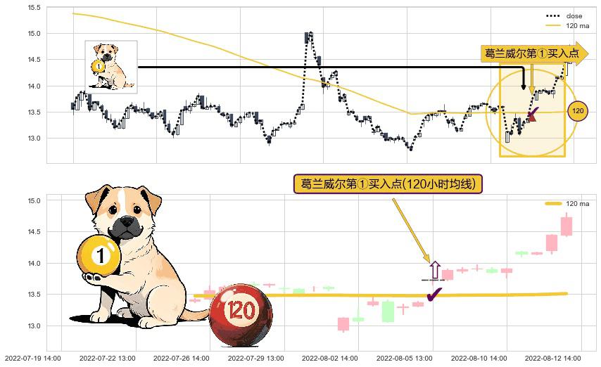 ⚀ 2022-08-05 13:00:00-小时显现 葛兰威尔均线 120小时均线 第买①入点 走势反转见底信号,后市看涨,买进信号