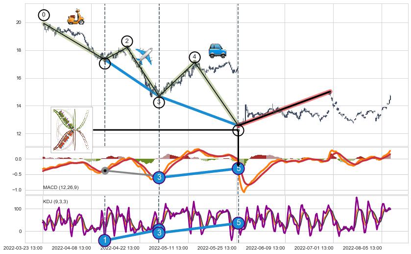 ➣ 第一, 三驱动浪端点:【KDJ】走势出现【常规背离 & 反转信号】背离程度63.73%,背离夹角角度109.6˚,背离程度较大