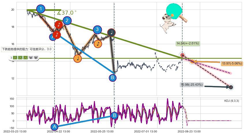 ➢ 预测:2022-08-18 13:00,【试探阻力】稳定目前下跌趋势的前提下,预测价格:13.97