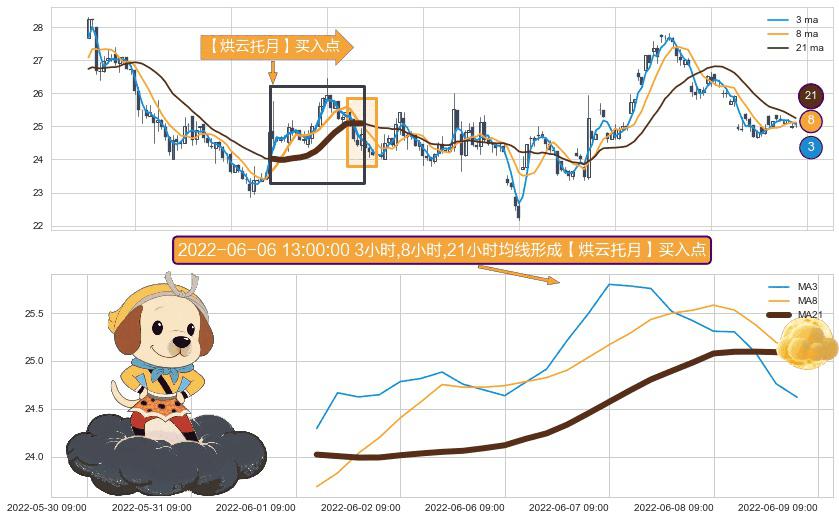 ⚀ 2022-06-01 10:00:00小时-2022-06-08 14:00:00小时显现 3小时-8小时-21小时均线 【烘云托月】买入点 看多信号,后市看涨,买入