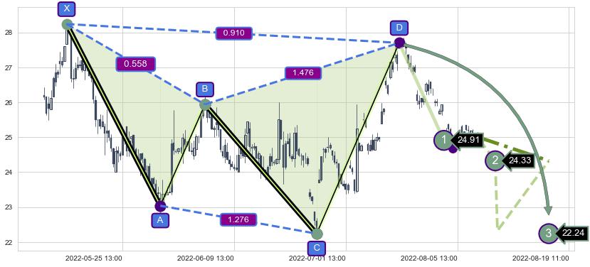 | 4 🅚:顶部尽头线(下山虎) ➕ 📡:谐波赛福已到达d点:猜想c拉升到达d点后泄力性下沉下跌(均值回复) ☞ 看空信号 ⇥ 【🅚线】交织【图形】⇥ 综合量化分数: 45 | > |