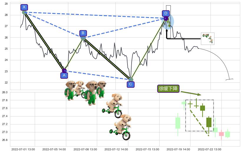 | 2 🅚:高档五阴线 ➕ 📡:谐波赛福已到达d点:猜想c拉升到达d点后泄力性下沉下跌(均值回复) ☞ 看空信号 ⇥ 【🅚线】交织【图形】⇥ 综合量化分数: 49 | > |