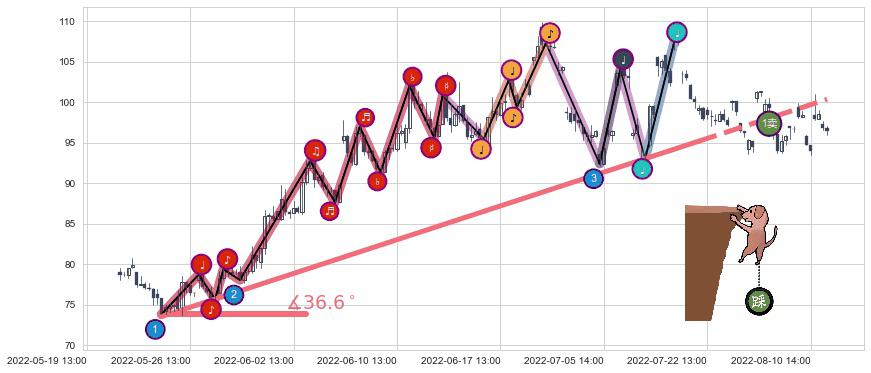 从2022-05-25 10:00至2022-07-21 13:00,共包含131个小时,阶段股价上涨33.04%,阶段股价变动位移路程比: 1 : 6,上涨趋势角度: 36.6