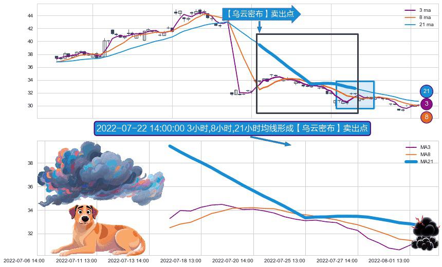 形态多维评估: ⚀ 2022-07-14 14:00:00小时-2022-08-01 14:00:00小时显现 3小时-8小时-21小时均线 【乌云密布】卖出点 看空信号,后市看跌,卖出