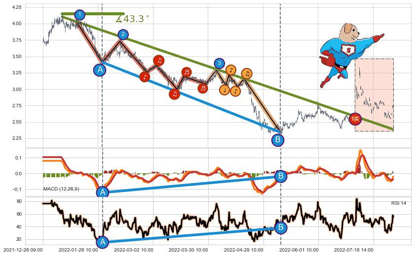 ⚔️ 2022-01-07 09:00-2022-05-20 14:00下跌趋势存在反转上涨[机会],其原下跌趋势的阻力位(2.390)已被突破[强支撑信号],原下跌趋势角度: 43.3˚