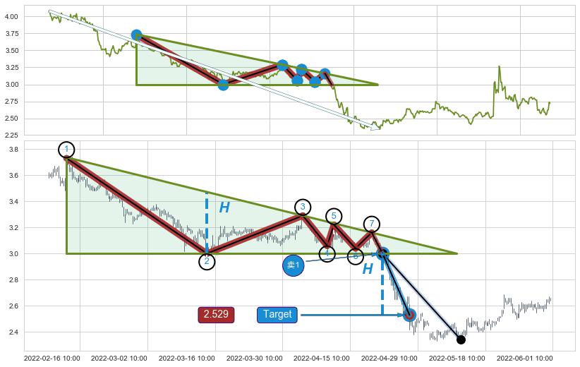 ➣ 最小中继整理跌幅→𝐇: 0.47098 (下侧直角边第一支撑点②与斜边垂直距离)