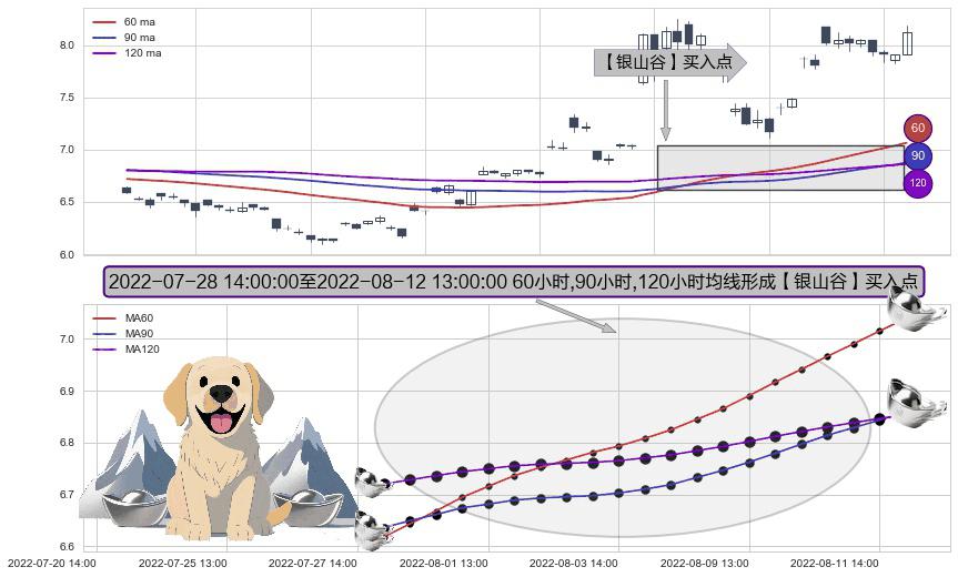 形态多维评估: ⚀ 2022-07-29 13:00:00-小时至2022-08-12 13:00:00-小时显现 60小时-90小时-120小时均线 【银山谷】买入点 看多信号,后市看涨,买入