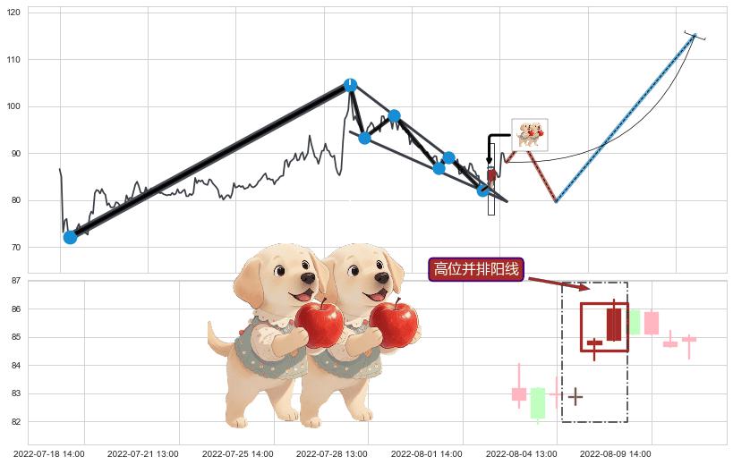 | 4 🅚:降势受阻 ➕ 📐:降楔型向上突破击穿阻力位, 猜想持续拉升上涨,被突破的阻力位已变为支撑位 ☞ 看多信号 ⇥ 【🅚线】交织【图形】⇥ 综合量化分数: 58 | > |