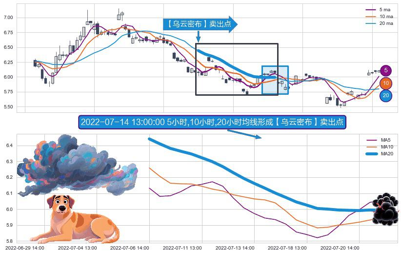 ⚀ 2022-07-06 14:00:00小时-2022-07-21 14:00:00小时显现 5小时-10小时-20小时均线 【乌云密布】卖出点 看空信号,后市看跌,卖出