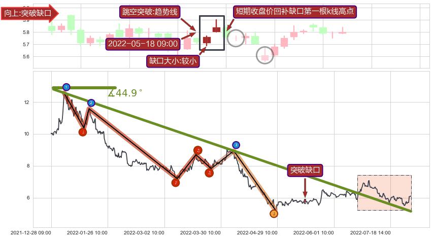 ➢ 突破缺口形成后,后续k已经超过14根,跳空突破趋势线关键点后, 出现【完全回踩】迹象,短期收盘价回补缺口第一根k线高点