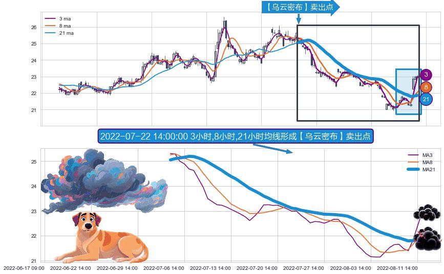 ⚀ 2022-07-05 13:00:00小时-2022-08-12 13:00:00小时显现 3小时-8小时-21小时均线 【乌云密布】卖出点 看空信号,后市看跌,卖出