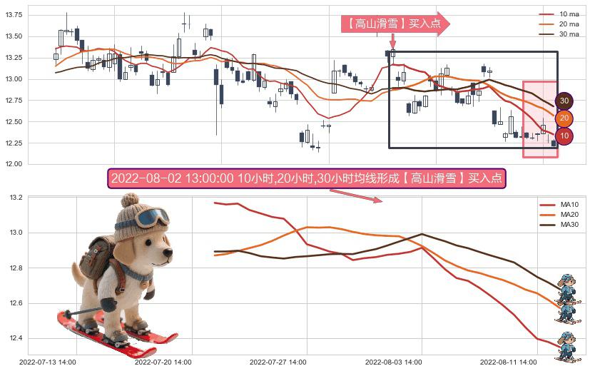 形态多维评估: ⚀ 2022-07-21 14:00:00小时-2022-08-12 14:00:00小时显现 10小时-20小时-30小时均线 【高山滑雪】买入点 看多信号,后市看涨,买入