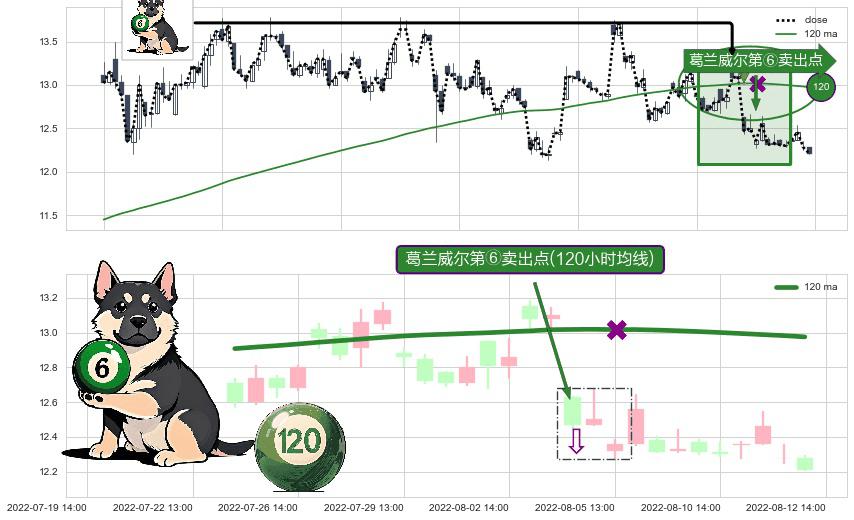 形态多维评估: ⚀ 2022-08-04 13:00:00-小时显现 葛兰威尔均线 120小时均线 第⑥卖出点 走势反转见顶信号,后市看跌,卖出信号
