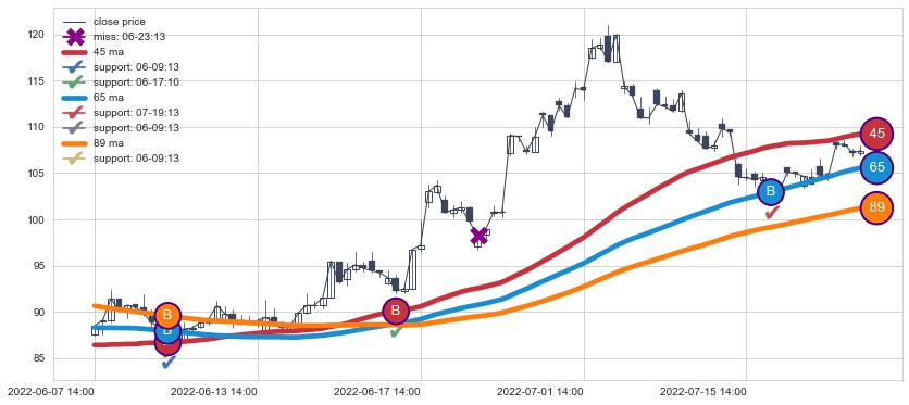 上涨趋势06-07 14:00-07-26 14:00,均线89, 65, 45确认关键支撑3处