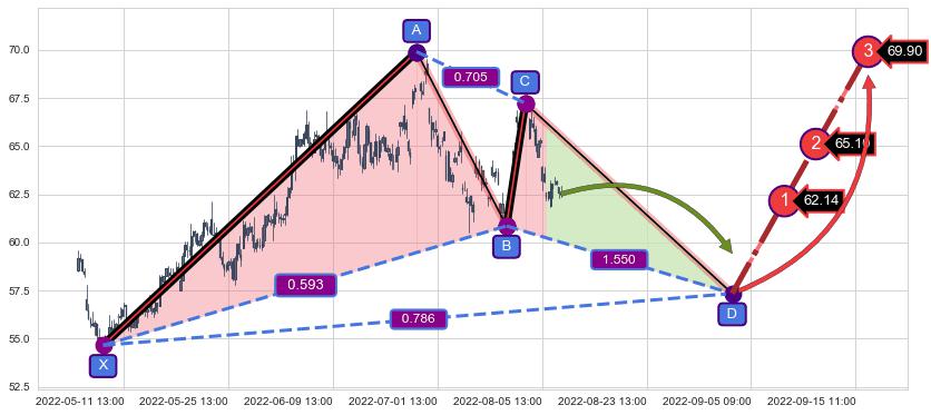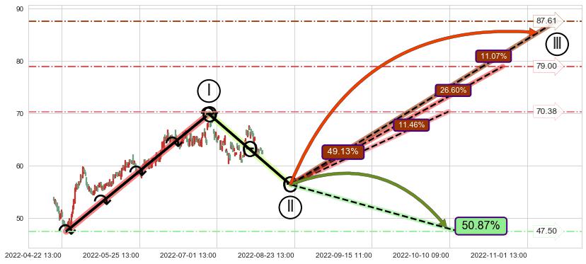 ➣ D点拟合预测价格57.34,距离最后交易收盘价格62.50相差 -8.25%