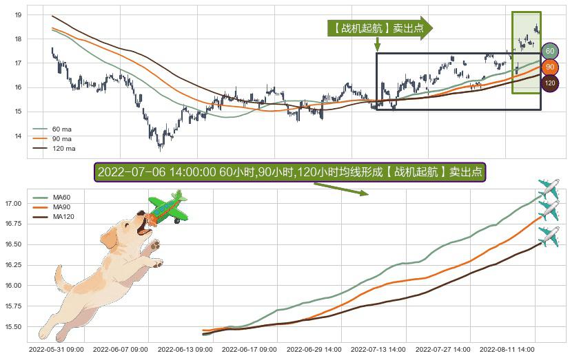 形态多维评估: ⚀ 2022-06-10 11:00:00小时-2022-08-12 14:00:00小时显现 60小时-90小时-120小时均线 【战机起航】卖出点 看空信号,后市看跌,卖出