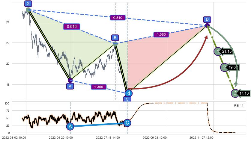 ➣ D点拟合预测价格23.64,距离最后交易收盘价格17.58相差 +34.48%