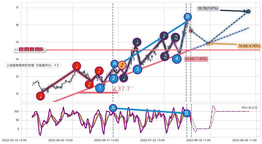 ♘ 支撑价格位14.29,可信任强度88.82%,距离最后交易2022-08-12 14:00形成的收盘价格15.67相差 -8.84%