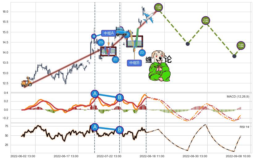 ➣ 【中枢A】:07-08:14-07-13:14,中枢由5笔构成,共7交易小时, ZG=14.18, ZD=13.96