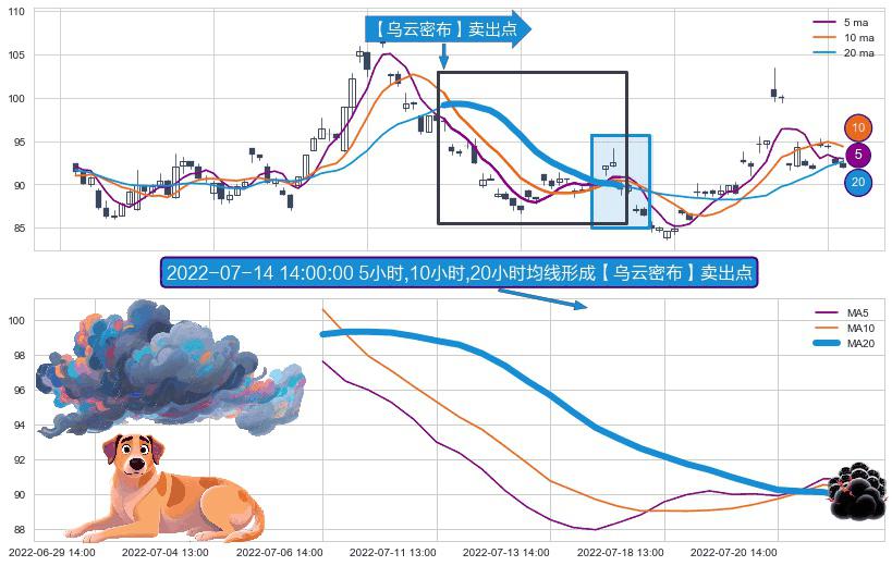 ⚀ 2022-07-06 14:00:00小时-2022-07-22 13:00:00小时显现 5小时-10小时-20小时均线 【乌云密布】卖出点 看空信号,后市看跌,卖出