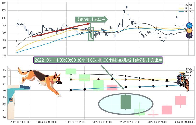 ⚀ 2022-06-14 09:00:00小时显现 30小时-60小时-90小时均线 【绝命跳】卖出点 看空信号,后市看跌,卖出