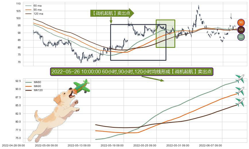 ⚀ 2022-05-13 13:00:00小时-2022-06-08 14:00:00小时显现 60小时-90小时-120小时均线 【战机起航】卖出点 看空信号,后市看跌,卖出